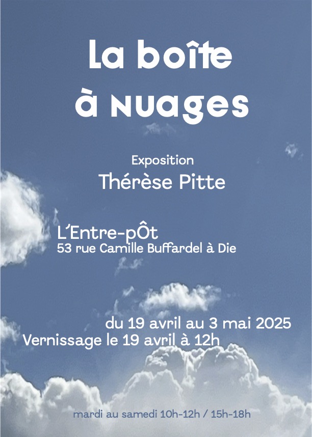 Cette exposition intitulée « La boîte à nuages », Thérèse montrera une partie de son travail sur un de ses sujets au long cours que sont les formations nébuleuses au-dessus de nos têtes ou qui s’accrochent sur les sommets de ses montagnes chéries.